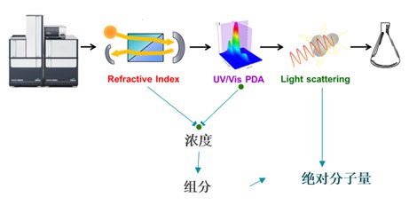 样品经过分离洗脱后,使用共聚物分析方法确定样品两种不同组分的浓度和分子量。计算方法如下: