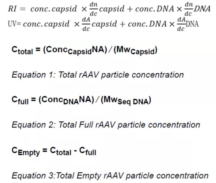 对于主体的单体峰,计算出其混合物分子量为4.49×106g/mol,其中86%为衣壳。rAAV5的蛋白质组分的分子量为3.89×106g/mol,这与表1中Empty rAAV5 的数据一致。单体是总体的93.2%,样本的总滴度为7.48x1013VP/ml。其中单体包含78% Full rAAV5,22% Empty rAAV5。需要注意的是,这种分析方法假设样品要么是Full ,要么是Empty ,忽略部分装载或过度装载情况。