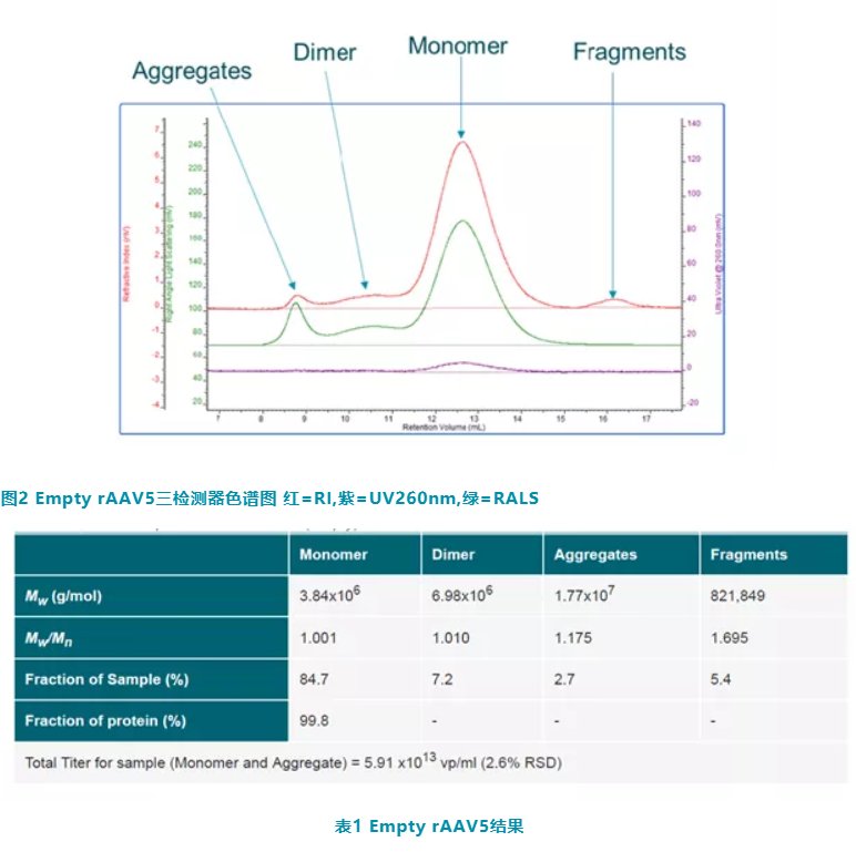 本文通过GPC/SEC和多角度动态光散射(MADLS)两种分析技术分析rAAV5样品,展示了快速、准确和可靠地定量测量AAV的病毒滴度(AAV Titer)和实心率(% full AAV)的方法。