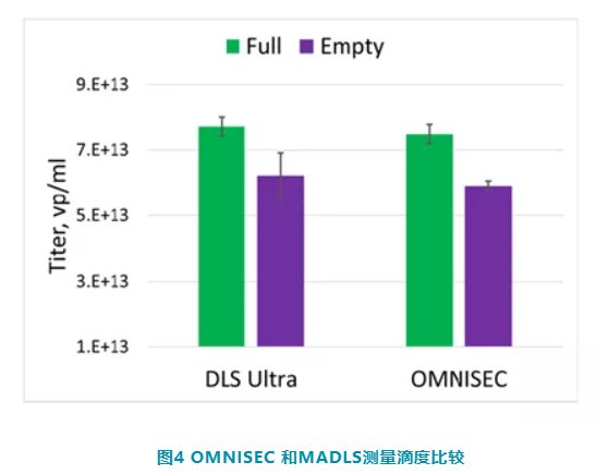 Zetasizer Ultra纳米粒度及电位仪可以使用MADLS方式快速确定病毒滴度。从OMNISEC获得的数据与Zetasizer Ultra的粒子滴度进行了比较,两种技术之间有很好的相关性,见图4。
