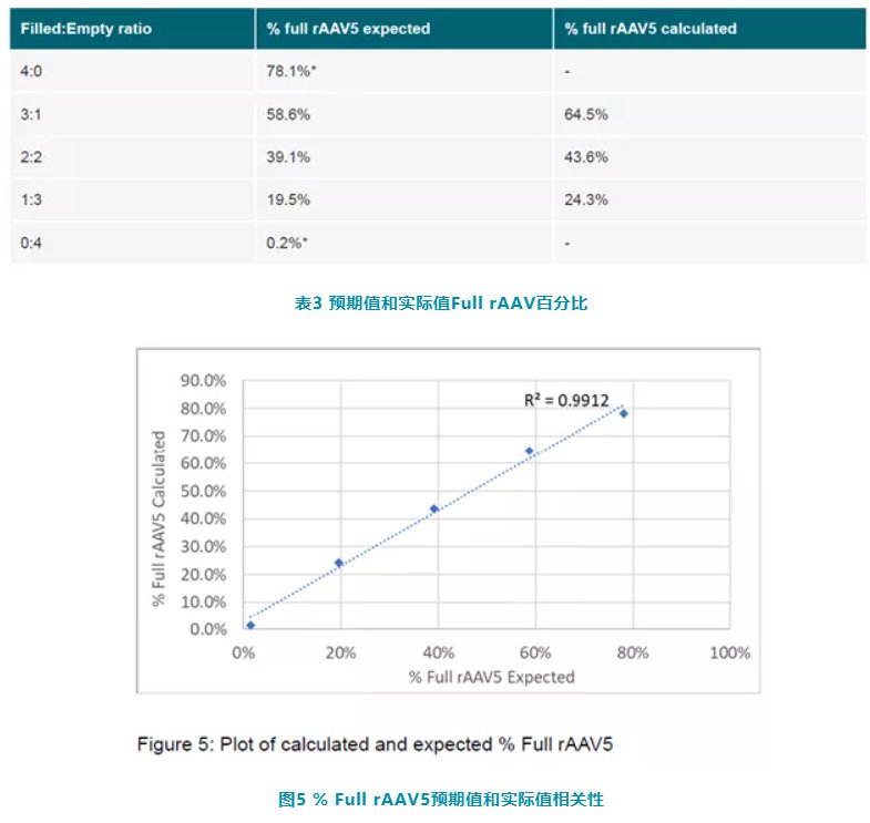 另外,本文将Full rAAV5和Empty rAAV5以确定比例混合,来对Full rAAV5样品进行分析。表3显示了每个样品的预期值和实际值Full rAAV百分比。图5显示了期望值和实际值之间有很强的相关性,证实了OMNISEC确定样品实心率结果的可靠性。