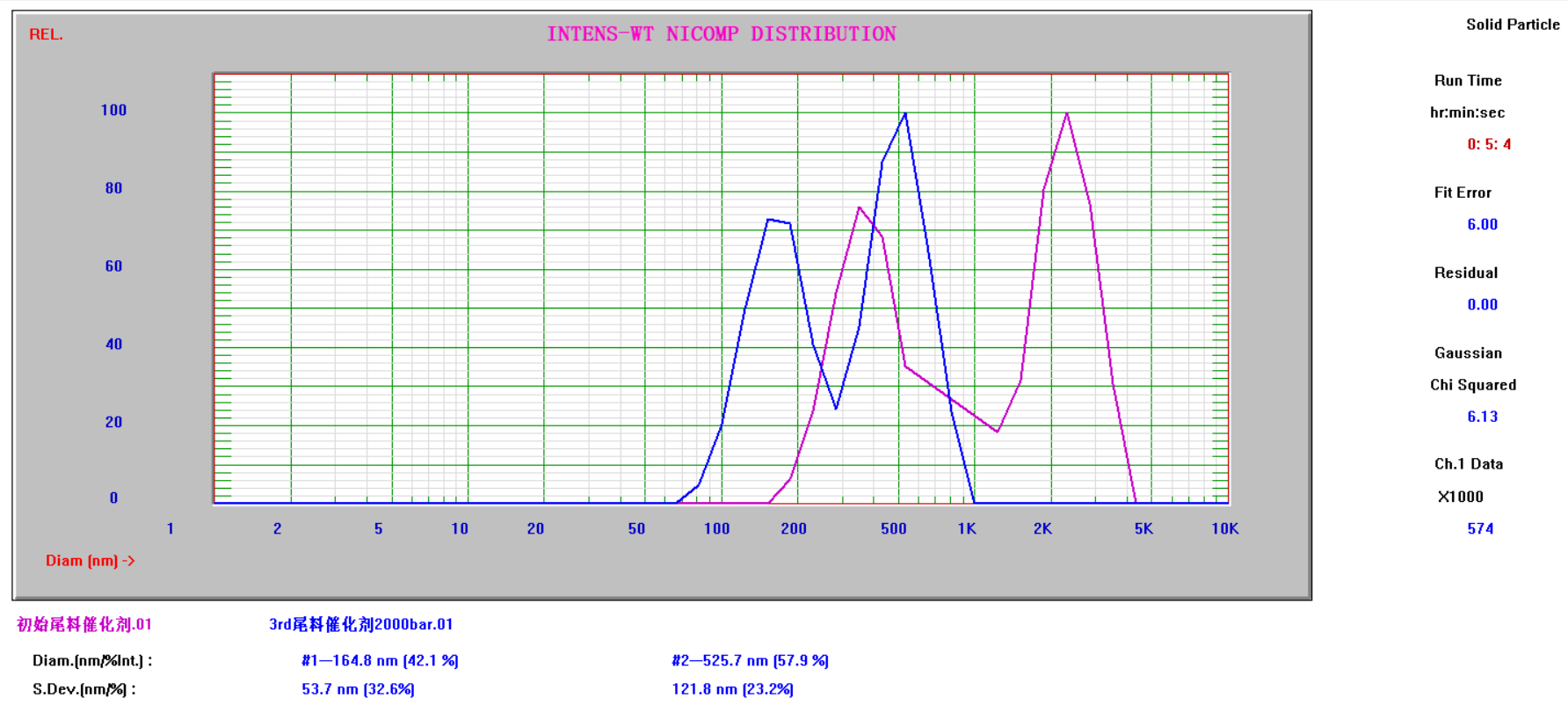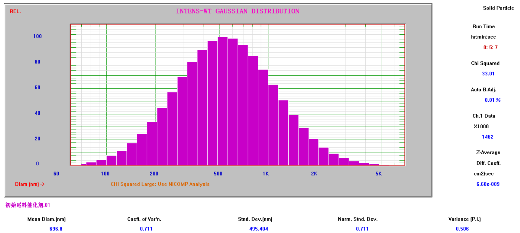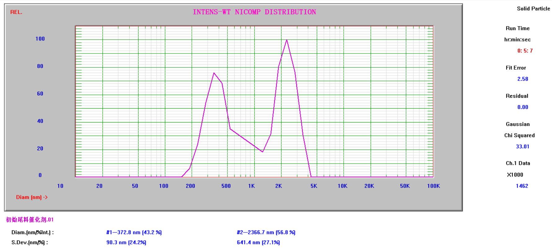 未均质过的初始尾料催化剂中有两个组分:372.8nm以及2366.7nm。(高斯分布拟合结果为:696.8nm)