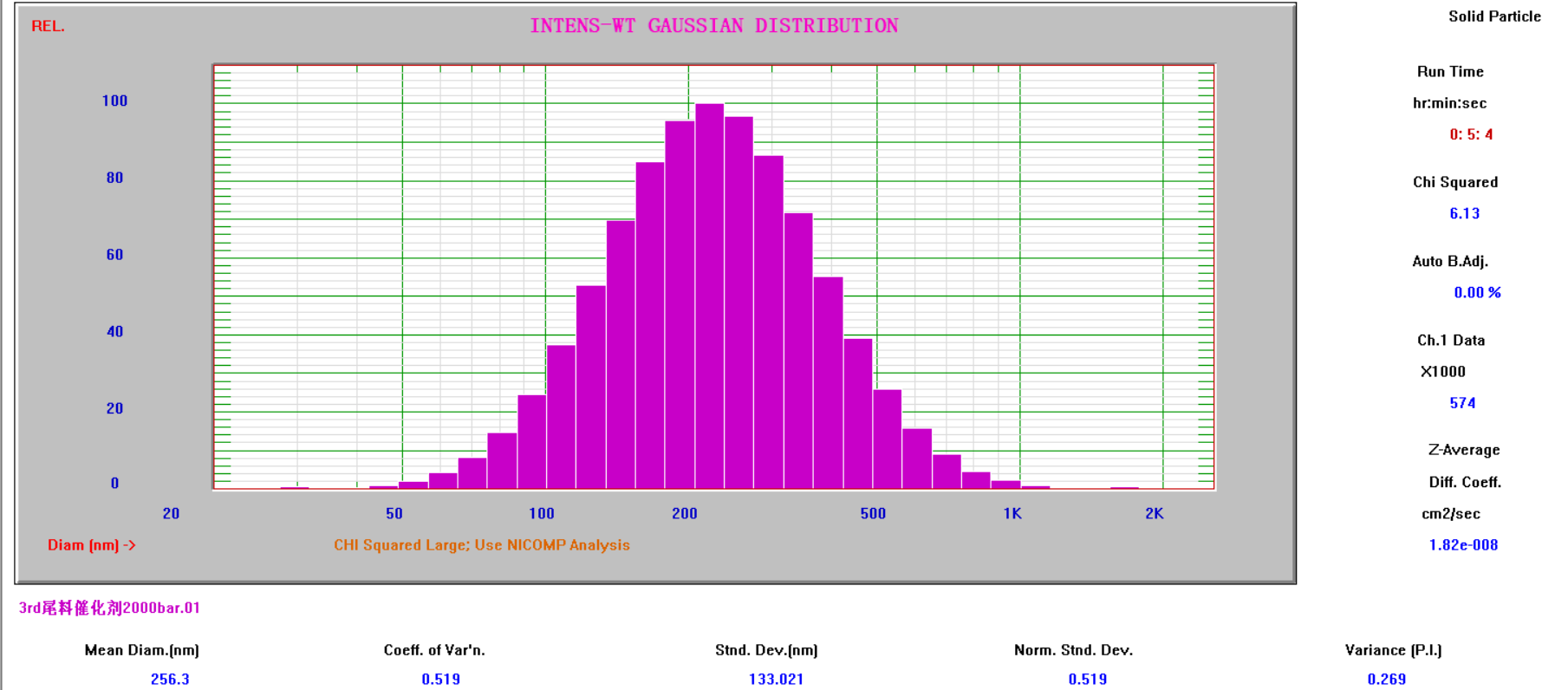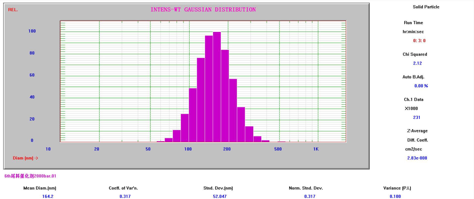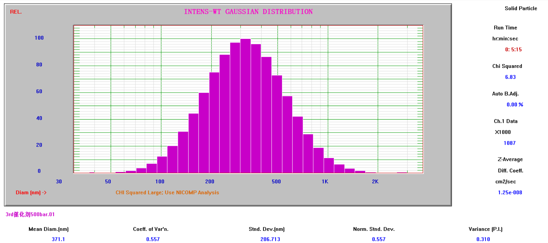未均质过的初始尾料催化剂中有两个组分:372.8nm以及2366.7nm。(高斯分布拟合结果为:696.8nm)