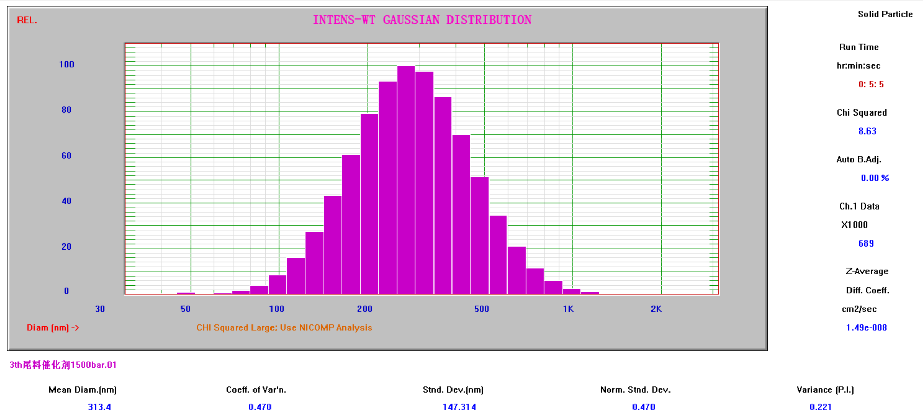 初始尾料催化剂经过1500bar压力均质3次后,平均粒径降至313.4nm