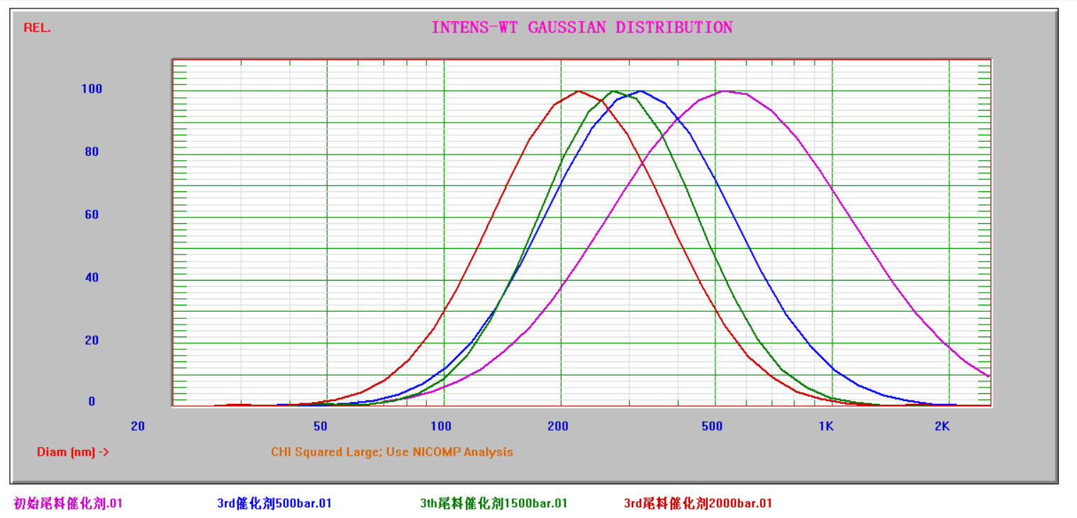 我们选取一组初始工艺并不理想的尾料催化剂,使用意大利PSI-20高压微射流均质机对催化剂进一步加工,并采用动态光散射仪及全自动颗粒计数仪结合的方式进行粒度分析。
