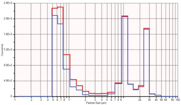本研究的方法验证是依托于制备10μm和25μm的聚苯乙烯乳胶(PSL)标准品混合物进行的。对初始浓度进行了分析,然后让其在重力作用下流经一套静脉输液器,收集流经后再次进行分析。图9展示了以每毫升颗粒数为单位的初始样品(蓝色)和留存样品(红色)的分析结果。