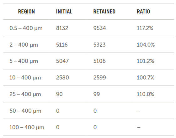 获取到的颗粒应出三个尺寸范围的报告:≥10 μm、≥25 μm,以及验证测试产生>75%回收率的最大尺寸。最大尺寸的下限应>50 μm。在采样过程中必须将颗粒混合/悬浮。验证测试涉及将已知颗粒尺寸和计数的悬浮液引入测试台和设备中。已知浓度的样品通过设备后,对流出物进行另一次颗粒计数测试。流出物中的颗粒应非常接近初始浓度。在≥10和≥25μm的条件下回收率必须>90%,系统才能被视为通过验证。还要确定回收率> 75%时的尺寸上限,以确定报告结果的第三个尺寸范围。
