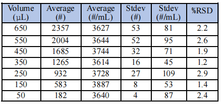 为了验证仪器,下表是以15um的USP Particle CoumntRS标准粒子(颗粒浓度:3118-4218 #/mL),搭配微量进样系统,进样量从650mL到50mL,分别测三次算出其平均颗粒浓度,并计算相对标准偏差RSD值。从结果可知,仪器最小进样量可达50L,RSD仍保持在2%左右。