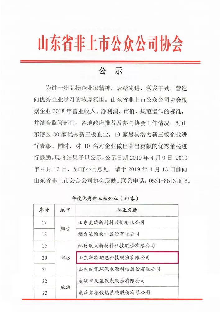 本次会议根据企业2018年度营业收入、净利润、市值、规范运作的标准,并结合监管部门、各地政府推荐及参与协会工作情况,对山东辖区30家优秀新三板企业,10家最具潜力新三板企业进行了表彰。华特公司在全省五百多家新三板企业中脱颖而出,荣获“2018年度优秀新三板公司”称号。