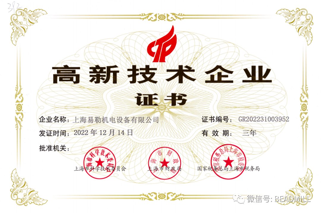 热烈祝贺上海易勒机电荣获“高新技术企业”称号!