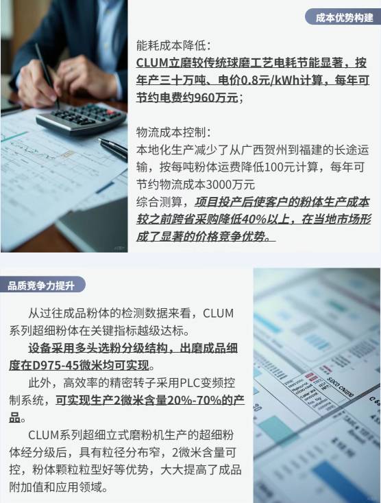 福建项目通过不同类型设备的集群化配置(如CLUM立磨与HGM磨粉机的组合),实现了非金属矿加工的"质量兼顾、**分级",满足多元化市场需求。该种集群化的生产线,在产能灵活性、产品适应性和投资回报率上均具有明显优势,为行业设备配置提供了新的参考范式。