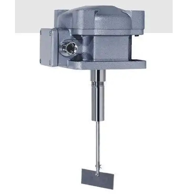 以阻旋式料位计为例,电机带动检测叶片旋转,当被测物料料位上升使叶片转动受阻时,叶片停止旋转,检测机构围绕主轴产生旋转位移,触发微动开关动作,发出有料位信号,并切断电动机电源使其停转;当料位下降至叶片无阻挡时,电动机依靠弹力恢复原始状态,触发微动开关动作,接通电源使其旋转,并发出无料信号。