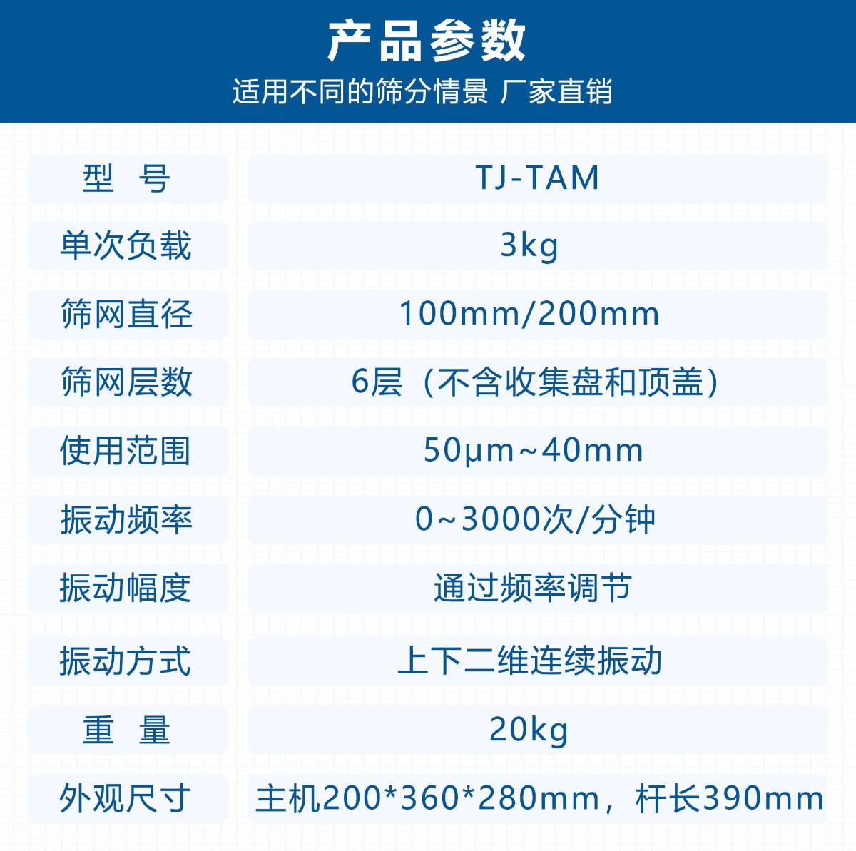 天津市东方天净科技发展有限公司为您提供东方天净TJ-TAM机械式筛分仪,TJ-TAM机械式筛分仪产地为天津市,属于振动筛,除了TJ-TAM机械式筛分仪的参数、价格、型号、原理等信息外,还可为您提供TJTR土壤研磨仪、TJG高通量组织研磨仪、TJS三维震击式球磨仪,东方天净客服电话400-810-0069转9015,售前、售后均可联系。