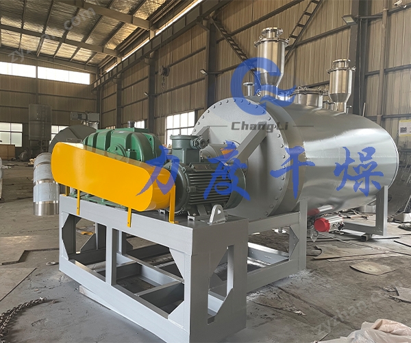溶液从真空耙式干燥机干燥机的中间部分送入耙式干燥机。在耙齿的连续旋转中,原料和耙子之间的接触面总是变化的。干燥材料通过蒸汽间接加热,材料中的水蒸发。蒸汽将由真空泵泵出。