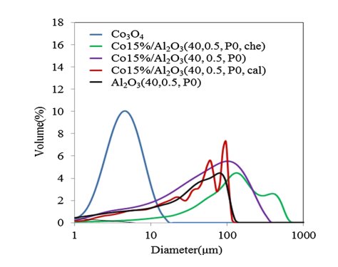 P0处理后Co3O4、Al2O3、Al2O3(40min,0.5mm,P0)、Co/ Al2O3的粒径分布图