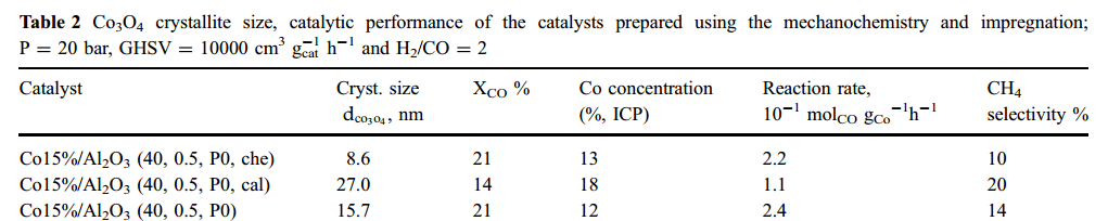 通过新的无溶剂机械合金方式合成了氧化铝基钴催化剂,低能量合成采用了Fritsch公司的行星式球磨机PULVERISETTE 0,通过对比,这种方法不仅可以合成高效的此催化剂,而且可以达到行星式球磨机所带来的效果。通过研磨过程,多孔的γ- Al2O3颗粒会存在磨损和碎片化现象,研磨的过程会使空隙填充。通过此机械化学合成方法,功能粒子Co被布局在了氧化铝基质颗粒的表面。通过优化机械合金化的反应条件,能达到很高的费托反应速率,催化剂的活性大大提高是因为Co相对高的分散性和没有了传统浸渍法生成的惰性硅酸铝盐。
