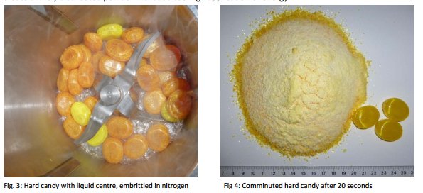按强制规定,为检测水果味糖果中的维生素和其他添加剂,破碎等前处理后进行高效液相色谱分析,色谱分析的检测用量一般都只需要毫克级,这就需要进行充分的均质,这对含糖量高的样品来说,充分分散均质比较困难。由于高含糖和维生素,需要研磨前液氮冷冻使其变硬脆,并保持维生素在低温下的稳定。