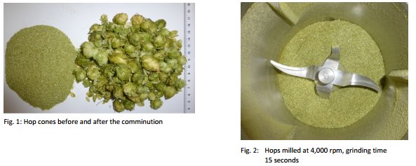 啤酒是众多人喜爱的一种酒水,而酿造啤酒将会用到啤酒花,此花中有许多物质有药理作用,会对人们的身体产生影响。许多次生植物的物质,如腐殖质,石竹烯,以及某些植物染料具有消炎和舒缓的效用,可能它们包含了与身体自身睡眠荷尔蒙褪黑激素有关的与物种相关的作用机制。为了这些物质的提取分析,需要将新鲜的雌蛇麻球果进行粉碎,如图: