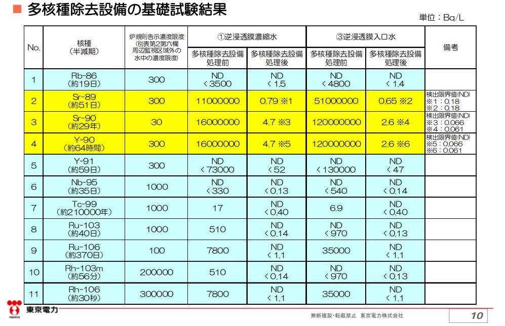 我们查了很多日本的新闻,没有找到这次的废水中辐射物质的浓度。但是我找到了东电用的“多核種除去設備”的一个检测报告: