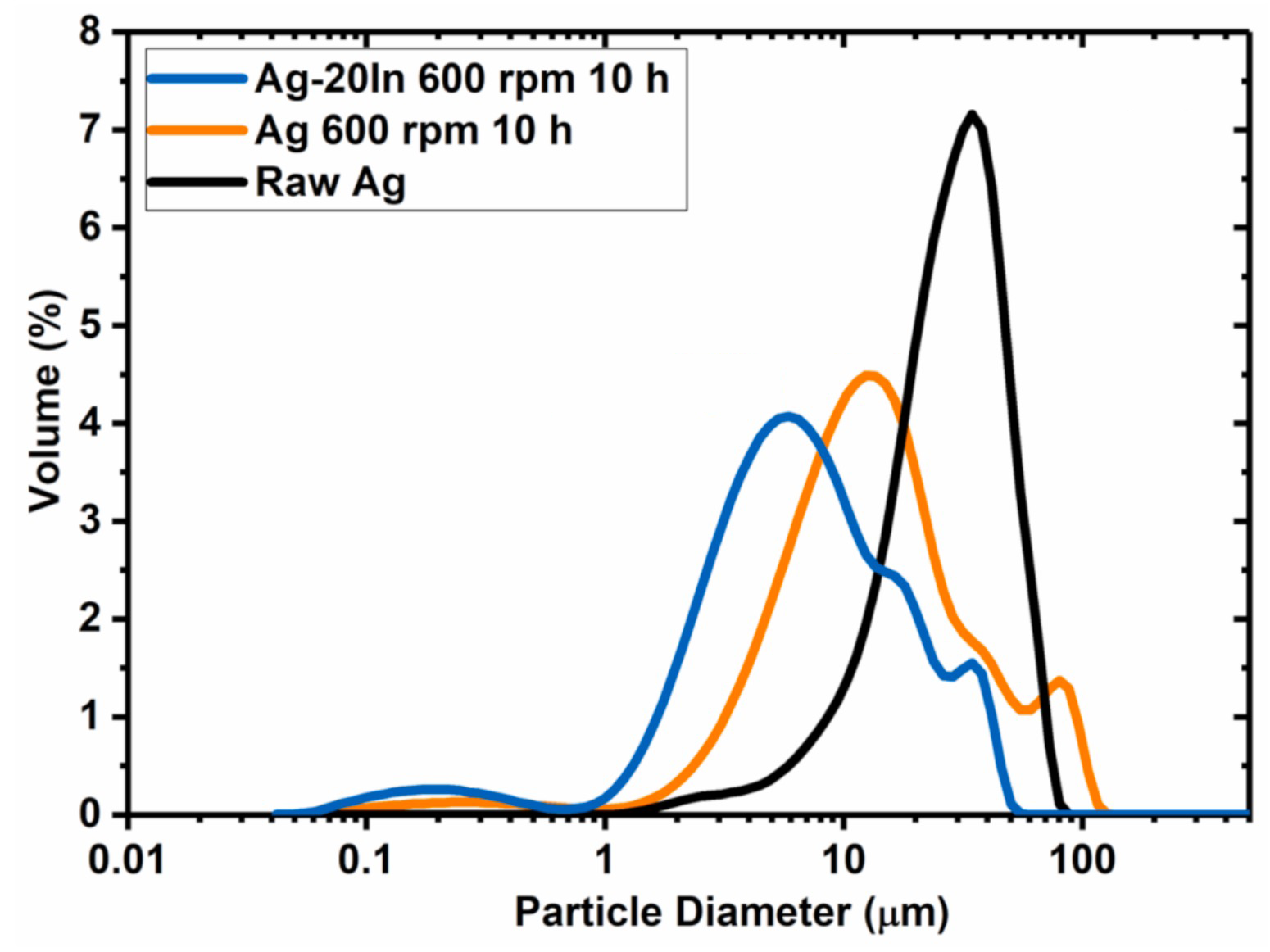 由于Ag粉/In粉本身具有延展性,故在研磨过程会产生冷焊效应,造成明显的团聚,可通过添加适当的硬脂酸来有效地抑制。