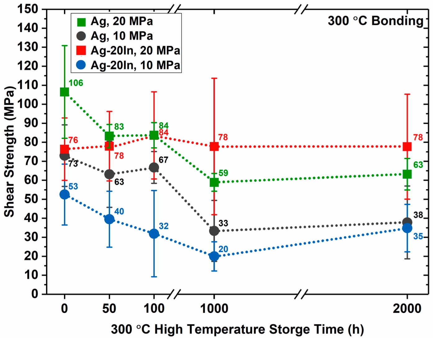所有测试均在300℃的高温下进行,上图为在高温存储时间50h、100h、1000h与2000h四个阶段的材料剪切力变化趋势。