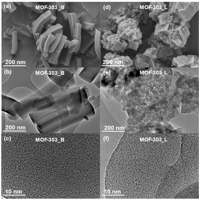 另外,从(b)、(c),(e)、(f)分别可以看到两种方法得到的材料均具备与典型MOF结构符合的多孔结构。