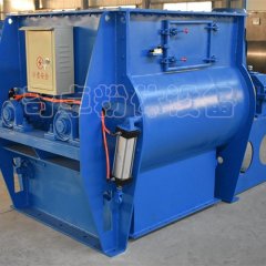 无重力混合机采用卧式W型筒体,内设两组反向旋转的平行轴,两轴上装有相反角度的浆叶(称双卧轴),运行时带动物料达到抛物线的高点使物料瞬间失重,称之为无重力点,在该点不同粒径、不同密度的物料实现均匀混合,亦称无重力双轴浆叶混合机,两侧的物料即反向运动,物料相互落入对面区域内,中央部位形成对流,从而确保物料径向、环向、轴向三向抛洒运动,形成复合循环,迅速达到均匀混合,无重力混合机设计混合时间1~3分钟,混合后由底部出料。