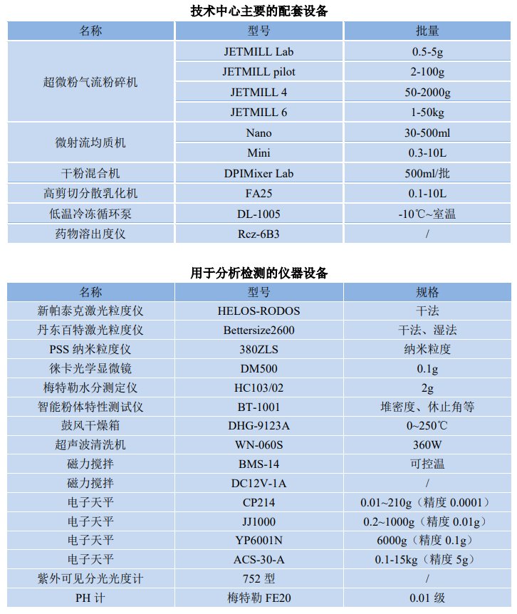 技术中心配备实验型、小试、中试、直至生产的超微粉气流粉碎设备,满足0.5g-50kg批量的微粉化服务。配备的深冷粉碎系统,可以满足热敏性、强静电原料药的微粉化。生产基地配备的大生产型设备可满足年产量20吨的粉体的粉碎。