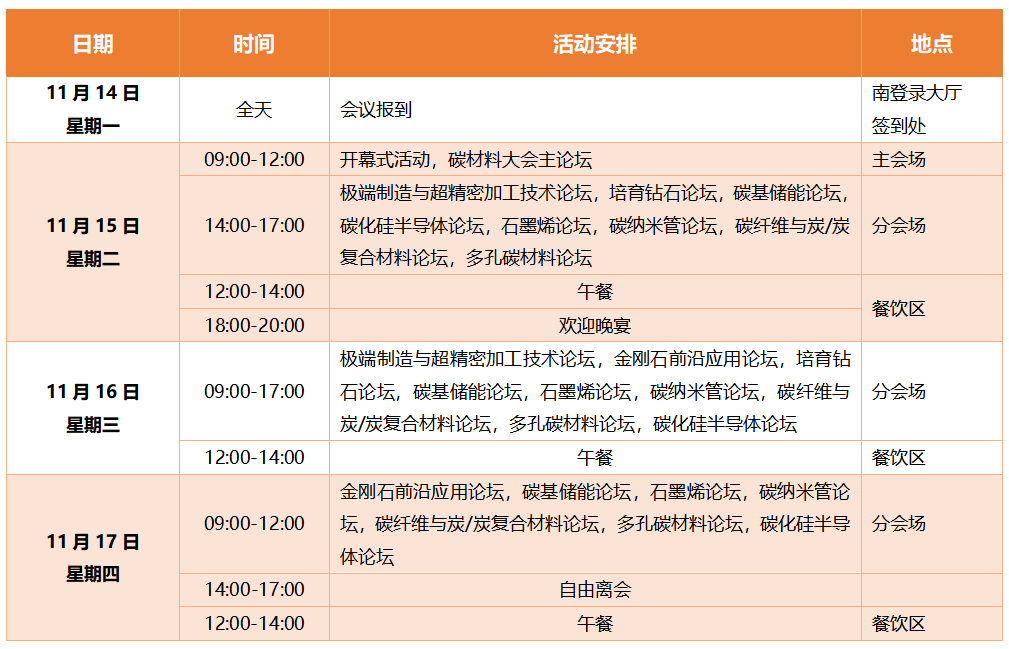 本次大会将设置1场 主论坛,9场分论坛,7场主题Workshop圆桌对话,20000㎡ 展览,邀请600+ 院士专家、300+ 报告分享,分享行业研究成果和先进技术,体现产业发展趋势。一站式了解碳材料的科学前沿、技术发展和工程应用。目前已吸引1500 余家企事业单位报名参会观展。