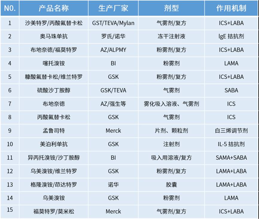 常见的慢病呼吸系统疾病所用吸入制剂类型药物包括: