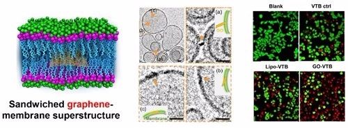 墨烯-生物膜“三明治”超级结构及其在药物递送中的潜在应用。(左)模拟图;(中)冷冻透射照片;(右)膜间递送药物(GO-VTB)的优势结果