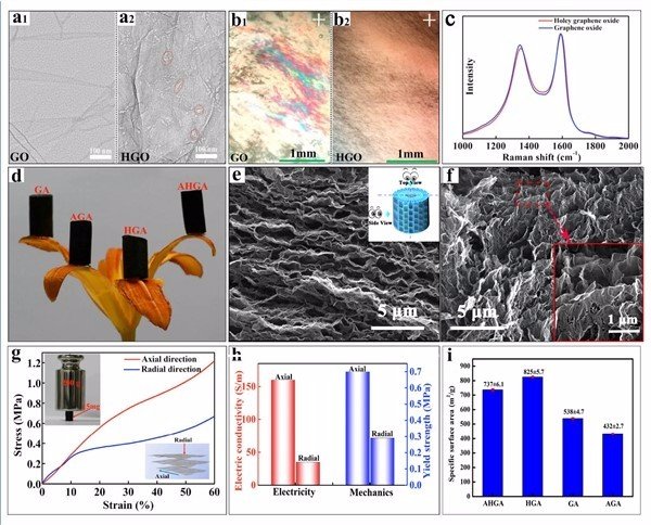 图:各向异性“孔洞石墨烯”气凝胶基本表征:氧化石墨烯片层的透射电镜照片(a1)及氧化石墨烯液晶的偏光显微镜照片(b1),孔洞氧化石墨烯片层的透射电镜照片(a2)及氧化石墨烯液晶的偏光显微镜照片(b2),氧化石墨烯及孔洞氧化石墨烯片层的拉曼光谱(c),各向异性“孔洞石墨烯”气凝胶的光学照片(d)、扫描电镜照片(e,f)、力学(g)、电学(h)及比表面积数据(i)。