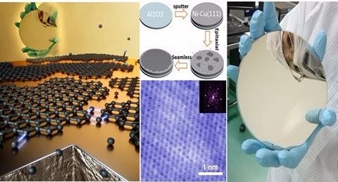 左图:石墨烯单晶晶圆生长设计及实验结果;右图:低温制备的6英寸石墨烯单晶晶圆