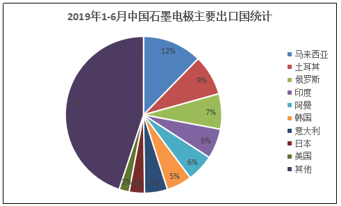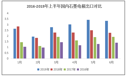 从量上来看,2019年1-6月国内石墨电极月均出口量高于过去三年,尤其是今年,出口量增量非常明显,可见近两年中国石墨电极在海外市场出货量呈现上升趋势。