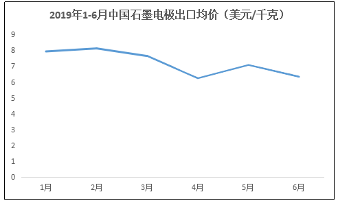 在国内价格大幅走跌的情况下 ,大家纷纷将目光瞄准了出口市场,由1-6月国内石墨电极出口均价可以看出,尽管整体呈现下跌趋势,最低谷出现在4月,为6.24美元/千克,但仍高于同期国内平均价格。