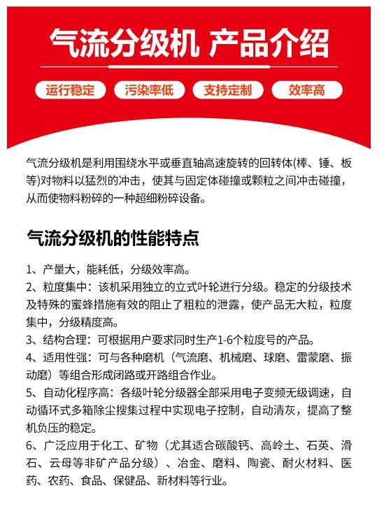 根据摩克立官方产品资料显示:超细粉末气流分级机的耗气量(L/min)为0.5,装机功率为22kw,处理量为1000-3000kg/h,分级效率为1000-3000kg/h,分级细度为1-150um,工作原理为自分流式,超细粉末气流分级机的价格为68000元,具体型号是qwl-10,品牌为摩克立。