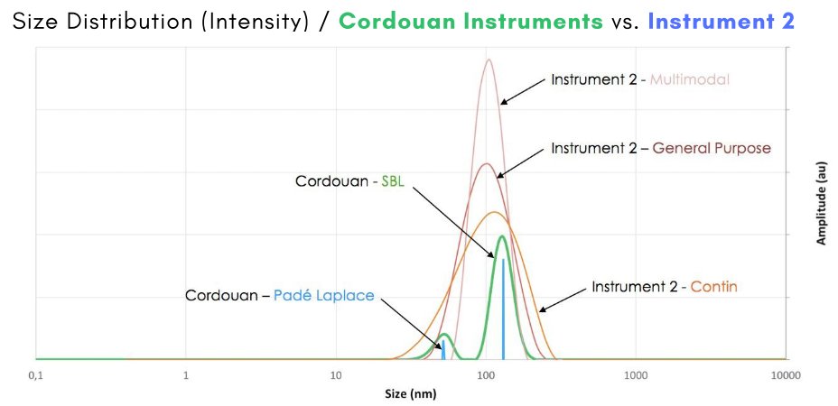 众所周知,常规DLS技术分辨率并不高,而低分辨率会掩盖更复杂的粒径组成,并且可能导致误判。因此,尽管多分散性相对较低(<0.2),但基于高斯分布的累积量模型(Cumulants)并不完全适用。实验证明,无论是常规模型(General Purpose),还是多峰模型(Multimodal)或Contin算法,即使熟知的DLS纳米粒度分析仪也不能对30nm和100nm的NIST标准乳胶颗粒的混合样品给出正确的结果(图2),而Vasco(Vasco Kin)却能完全分辨开这两种标准乳胶颗粒,验证了Vasco软件专有的BSL算法和 Pade-Laplace算法具有超高分辨能力(图3,图4)。