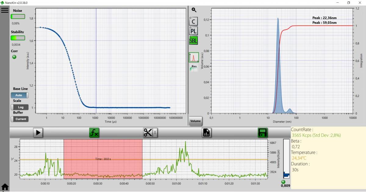 图4. 用Vasco Kin动态监测样品粒度变化。在30秒的时间切片(下图)中,两种小于100nm的颗粒峰值分别为22.36nm和59.03nm,峰-峰比小于1:3(右上图), 体现了极高的分辨能力。