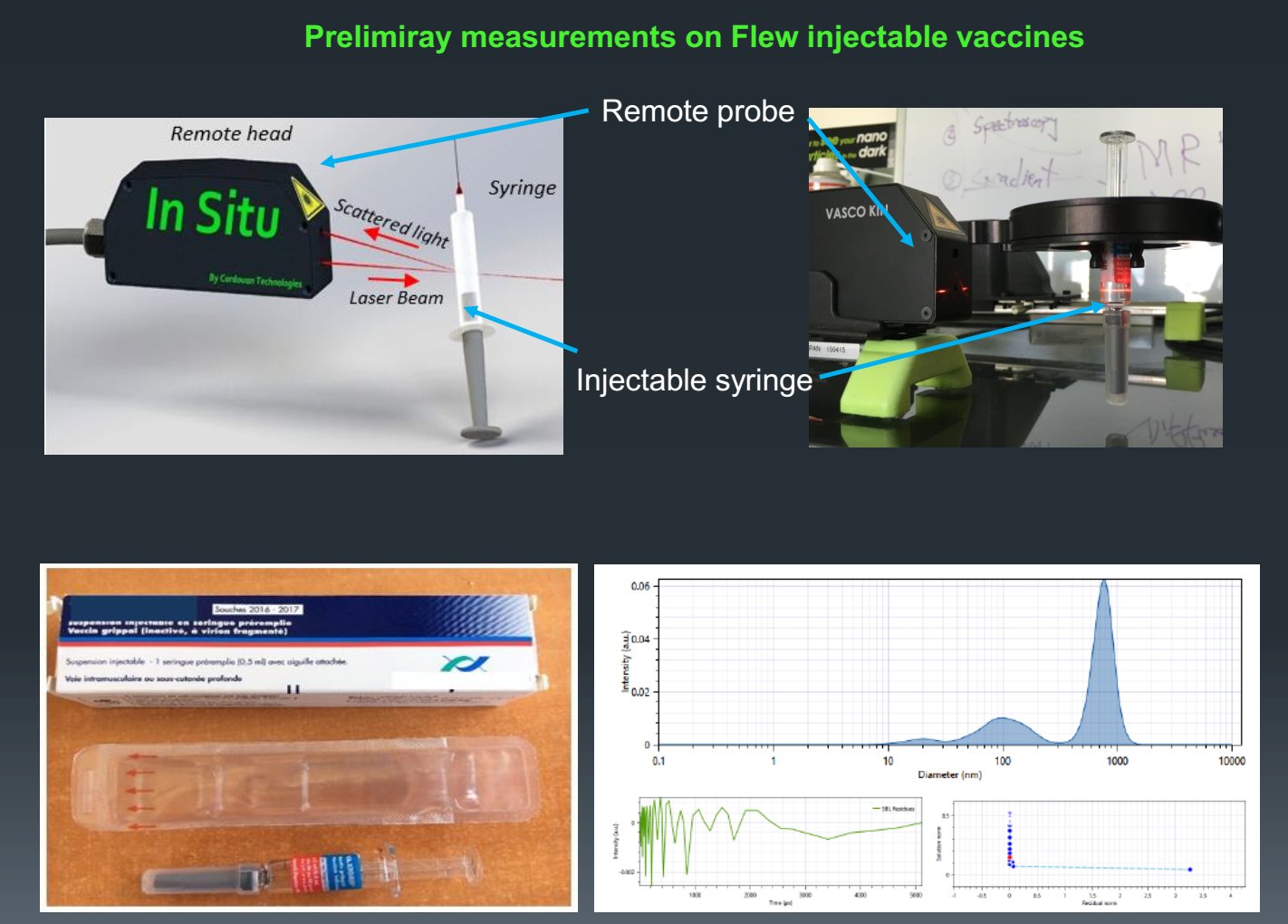 注射用生物制药产品中蛋白质和活性成分(API)的聚集仍然是影响疫苗产品稳定性和可用性的主要问题。蛋白质聚集可以发生在蛋白质治疗药物生命周期的所有阶段,包括状态,复性,提纯,灭菌,运输,储存和交付过程。流感疫苗针剂(见图6-左下)是由多种不同成分混合而成的,包括培养基、去活化病毒和几种赋形剂。从塑料透明包装中取下疫苗注射器(图6左下),并将其放置在Vasco Kin探头前面6cm处的专用支架上(图6右上)即可透过玻璃针管进行粒度分布测量(图6右下),不需要取样。验证实验表明,即使不拆除塑料透明包装进行测试,结果与拆除包装后的也非常一致(2)。
