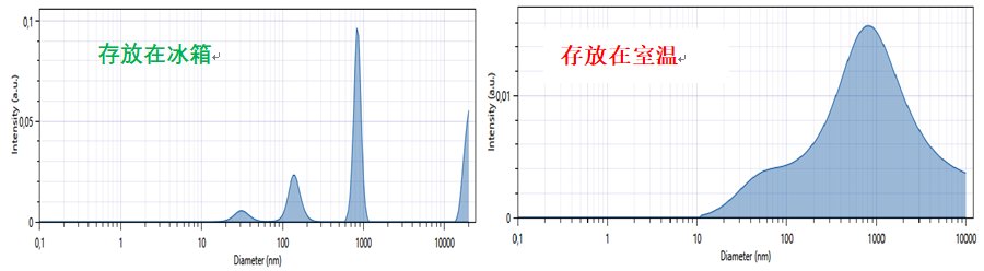 将流感疫苗分别储存在7℃的冰箱和室温下8个月,在相同的条件下,原位测定两个疫苗中的纳米颗粒,粒度分布结果如图7所示,二者产生了巨大差别。