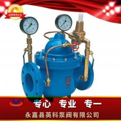 当阀门出口压力降到导阀弹簧设定压力时,导阀开启,控制室向下游排水。由于导阀系统排水量大于针阀的进水量,主阀控制室压力下降。进口压力使主阀开启。在稳定状态下,控制室进水、排水相同,主阀开度不变,出口压力稳定。调节导阀弹簧即可设定出口压力。