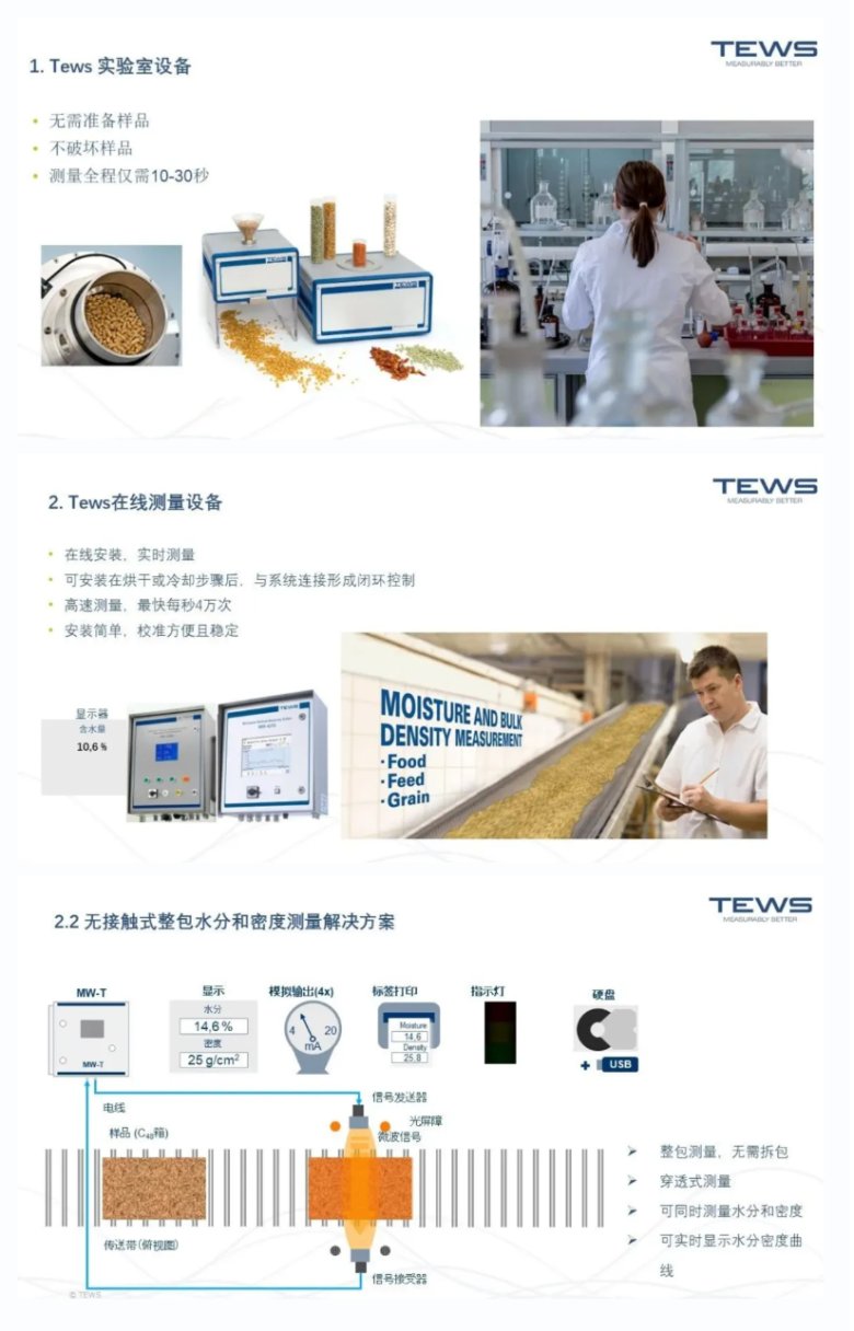 我们的技术工程师结合国内大量客户案例,总结了以下典型应用: 01烘焙原料与糕点生产(面粉、淀粉、面包糠等) 痛点: 入厂面粉水分波动大,影响配方和最终产品吸水率,导致面团软硬不一,产品品质不稳定。 TEWS方案: 在投料口或输送线上安装传感器,实时监测 incoming 原料水分,及时调整工艺参数(如加水量),确保每批产品口感一致。同时,为原料按质论价提供可靠依据。 02肉制品加工(肉糜、肉馅、蛋白制品等) 影响出品率、口感和合规性(国标有严格水分上限)。 TEWS方案: 在搅拌混合后、灌装前的输送线上进行监测。实时数据可联动控制系统,优化搅拌时间或辅料添加量,在合规前提下精准控制出品率,直接提升经济效益。 03糖果、零食与方便食品(薯片、挤压类零食、粉末调味料等) 痛点: 油炸或烘干工序是能耗关键点。过度干燥导致能效浪费和口感变差;干燥不足则影响酥脆度和保质期。 TEWS方案: 在烘干机、油炸线出口安装传感器,实时监控最终产品水分。数据可直接接入PLC,自动调节烘干机温度或传输带速度,实现闭环控制,在保证品质的同时,显著降低能源消耗。 04奶粉及乳制品(奶粉、乳清粉、酪蛋白等) 痛点: 油炸或烘干工序是能耗关键点。过度干燥导致能效浪费和口感变差;干燥不足则影响酥脆度和保质期。 TEWS方案: 在烘干机、油炸线出口安装传感器,实时监控最终产品水分。数据可直接接入PLC,自动调节烘干机温度或传输带速度,实现闭环控制,在保证品质的同时,显著降低能源消耗。 产品推荐 TEWS微波水分仪优势: 产品表面,核心同时测量 一次校准,简单稳定,不老化 水分,密度独立测量(全球独一份) 产品100%德国制造 01快速而准确的测量方法可节 省时间和资金 食品和原始产物的含水量对于质量、加工和耐久性至关重要。还需要考虑对食品的法律要求。为了保证在所有的制造工艺阶段中,产品中的水分含量恰当,就必须持续测量实际产品或其样品。传统的水分测量法涉及干燥炉或干燥平衡——一般需要对样 品进行准备,且始终都会给获得结果造成延迟: 如果一切顺利,会延迟数分钟,但通常会延迟数小时。 02立即获得结果 TEWS Elektronik的水分测量仪可立即向您提供结果。测量仪可极其快速地产生结果,且操作简单,可为您节省大量时间。TEWS的所有实验室系统和工艺系统均操作简便,且几乎完全无需维护。 03无需准备样品 通过微波共振水分测量法获得的结果不受被分析产品的密度、堆高或颜色的影响。因此,特别是谷物、含油种子和用原始产物制造的产品中的颗粒大小、颜色、矿物含量等的变化不影响结果。传统实验室测量方法的另外一个问题是,需要精确称量样品。