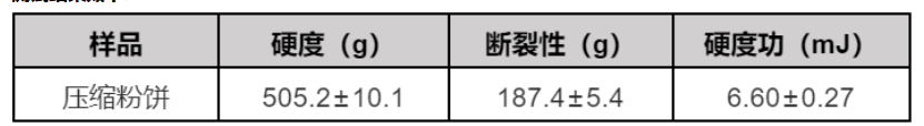 通过图1可知,当探头向下运行直至达到粉饼表面的破裂点之前,应力一直处于上升的趋势;到达破裂点时,图中显示第一个应力峰值;穿透表面后,测量的力值稳步增加,直到测量到第二个峰值,峰值越大,说明粉末的致密程度越高。