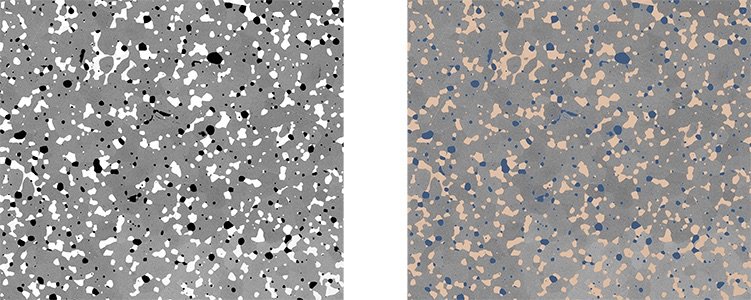 高级陶瓷材料的 30 张 Phenom SEM 图像的拼图(左)和晶粒分析图像(右)