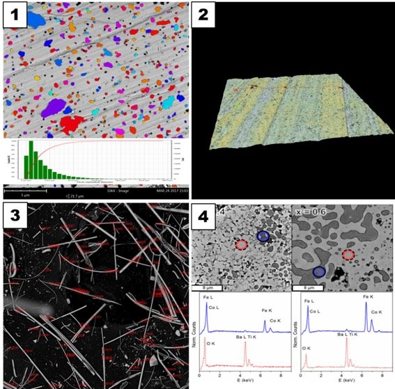 下图1,利用颗粒系统,对第二相进行晶粒度统计,并导出柱状图;图2,对材料表面进行 3D 立体重建,也可以进行粗糙度测量;图3,利用纤维系统,对陶瓷纤维直径与方向进行统计;图4,利用能谱对材料进行元素成分分析。