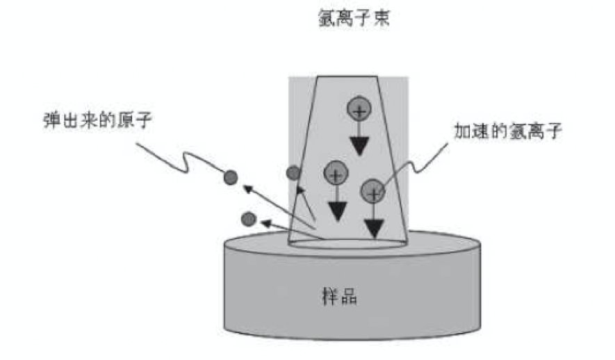 离子研磨实现的过程中,首先通过一个高压电极来对氩气进行电离,从而形成氩离子;继而再通过一个高压电场来对氩离子实施加速,经过带有偏转电场的离子枪头,使其形成离子束对需要研磨的样品进行轰击,将样品表面物质以原子的形态清除出去,以使得样品达到无应力研磨的效果。如图 1 所示。在整个过程中会调整一些参数,例如离子能量,离子束入射角,以优化样品制备时间和表面质量。