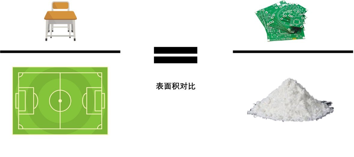 对于粉末样品,由于比表面积的增大,消耗的前驱体量也呈几何数量级增长。这意味着,相同质量下,粉末样品需要更多的前驱体进行 ALD 反应。而粉末的粒径越小,其比表面积越大。相同质量的平面器件其表面积与 1mm 直径粉末相差 10 倍以上,而与 10µm 粉末比表面差异更接近 16000 倍,相当于一张课桌与标准足球场面积的差别。