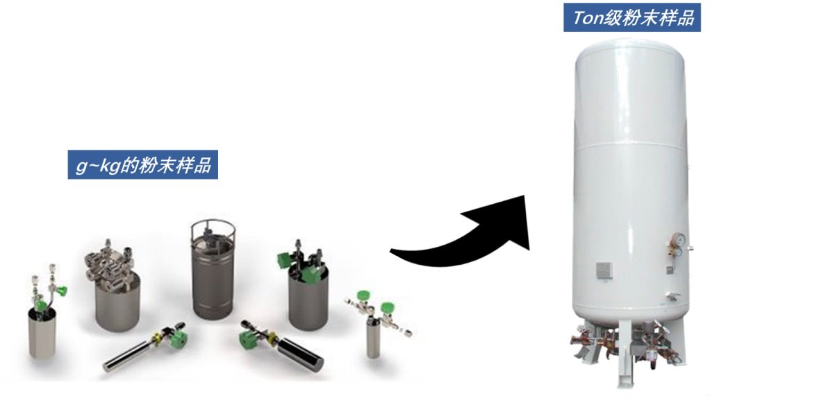 高比表面积的粉末样品不仅对前驱体的用量提出更高的要求,前驱体的存储以及输送方式同样重要。对于半导体行业而言,公斤级的前驱体储存瓶即可满足连续的生产要求。但粉末 ALD 包覆,尤其是锂电,金属等粉末样品,每年的处理量可达到吨级甚至百吨级,因此前驱体的供应需要使用更大的储存系统。