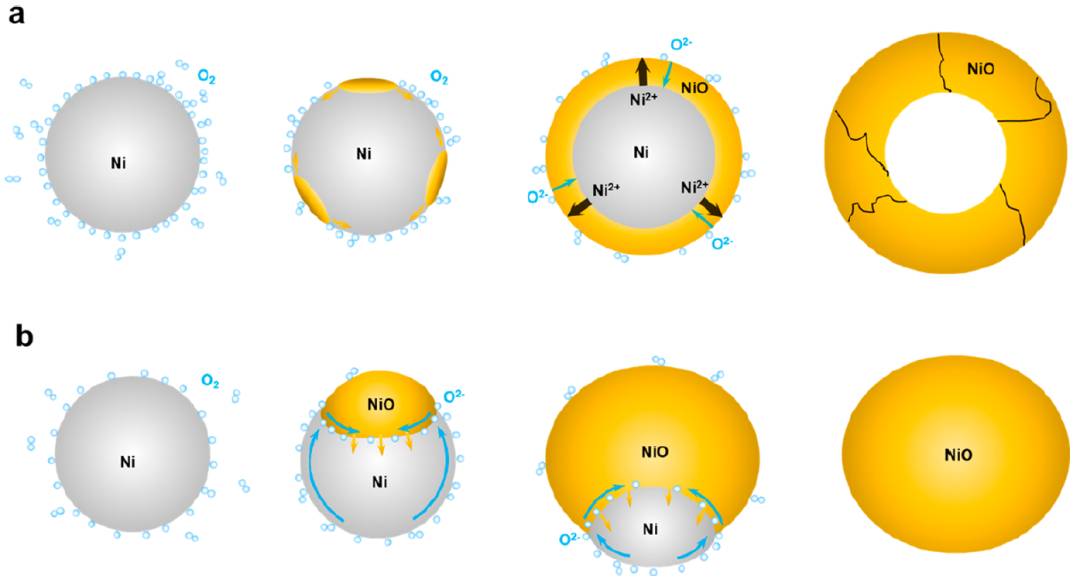 摘要:了解各种金属纳米颗粒在常压下的氧化机制,对于发挥它们在诸多领域中的最大价值是非常重要的。借助常压 TEM 技术,该团队研究了大气压下不同温度时镍纳米颗粒的动态氧化过程,揭示了一种温度依赖的氧化行为。温度较低(600℃)时,镍纳米颗粒的氧化遵循柯肯达尔效应,伴随着氧化物壳层的生成;温度较高(800℃)时,氧化开始于金属表面的一个单晶成核,然会沿着金属-氧化物界面逐步推进,直至全部氧化,期间并没有空洞生成。通过实验和 DFT 计算,团队提出了基于镍纳米颗粒的温度依赖的氧化机制,该机制归因于不同温度下气体吸附和扩散速率的差异。