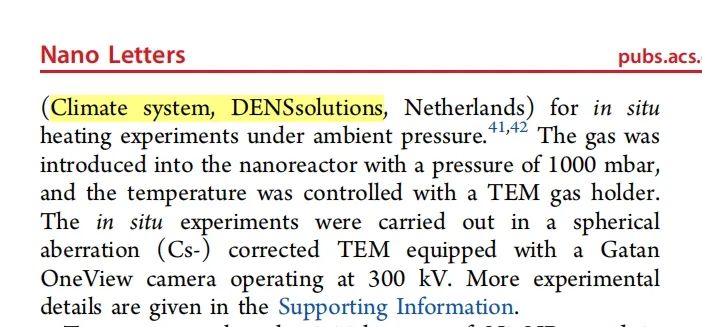 所使用的系统- Climate 气相加热杆:使用 DENS Climate 原位气相加热样品杆,研究团队可以在透射电镜中向样品区通入大气压强的氧化气氛,研究不同温度时镍纳米颗粒的动态氧化过程,并揭示其氧化机制。